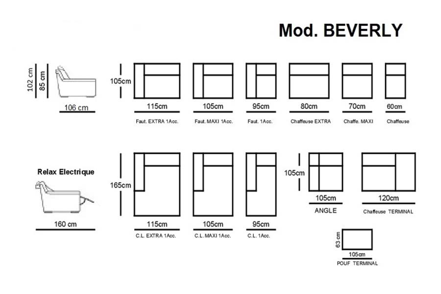 Dans la version relax, le modèle est équipé d'un mécanisme combiné avec mouvement du dossier et du repose-pieds, disponible uniquement dans la version électrique avec commande positionnée sur le côté extérieur du canapé. Les assises centrales ayant mécanique relax sont aussi équipées de commande située sur la partie latérale de l’assise. Tous les éléments, à la fois fixes et avec mécanisme de relaxation sont modulaires et assemblables par des crochets à baïonnette.
