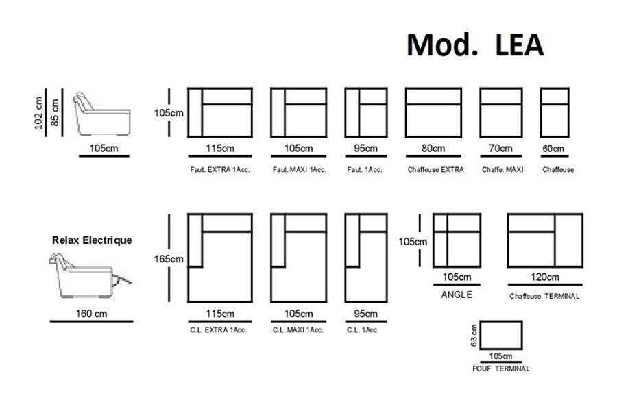dans la version relax, le modèle est équipé d'un mécanisme combiné avec mouvement du dossier et du repose-pieds, disponible uniquement dans la version électrique avec commande positionnée sur le côté extérieur du canapé. Les assises centrales ayant mécanique relax sont aussi équipées de commande située sur la partie latérale de l’assise.Tous les éléments, à la fois fixes et avec mécanisme de relaxation sont modulaires et assemblables par des crochets à baïonnette.